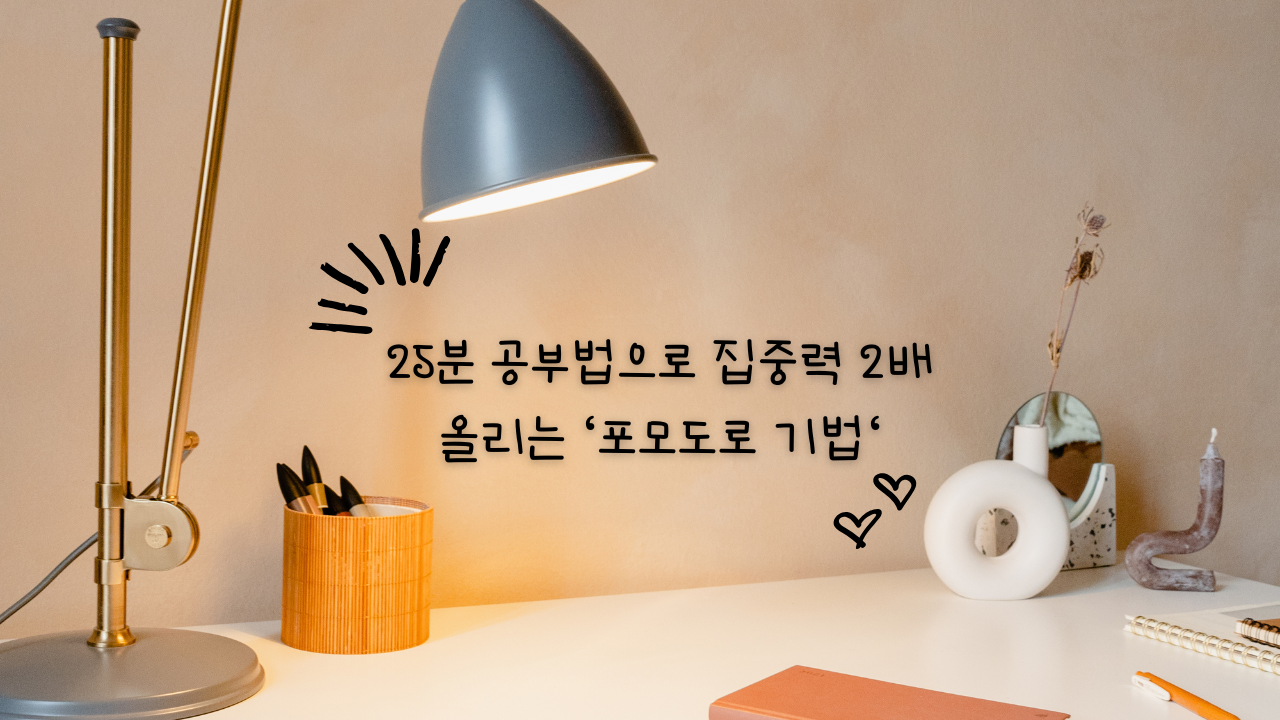 이탈리아 프란체스코 시릴로가 고안한 시간 관리법으로 <25분간 몰입 공부 + 5분 휴식>을 한 세트로 반복하며 집중력을 높이는 방법입니다. 이 방법은 짧은 시간에 '몰입'을 유도하고 중간중간 휴식으로 뇌 피로도를 줄이며 성취감을 높이는 데 큰 도움을 줍니다.