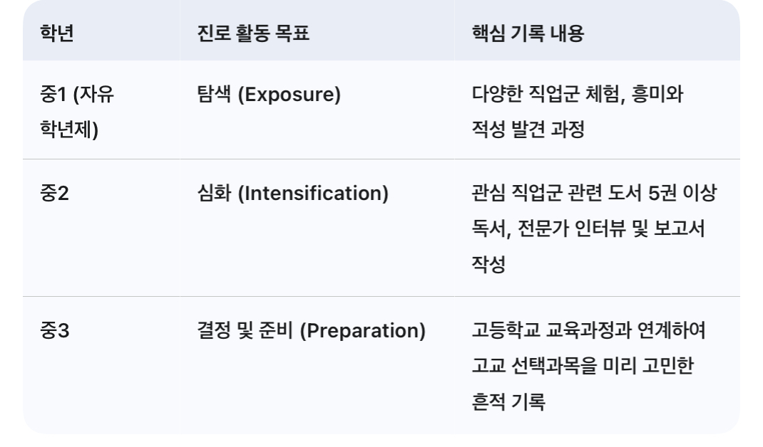 진로 활동은 학생의 관심사가 얼마나 깊고 일관성 있게 발전해왔는지 보여주는 핵심 영역입니다.